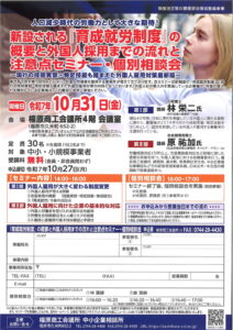 10/31日橿原商工会議所様主催のセミナーに登壇いたします。 外国人雇用について、社労士目線でのお話を担当させていただきます。 また弊所では、雇用に関するご相談全般をお受けしております。 基本的な健康保険や厚生年金、雇用 […]